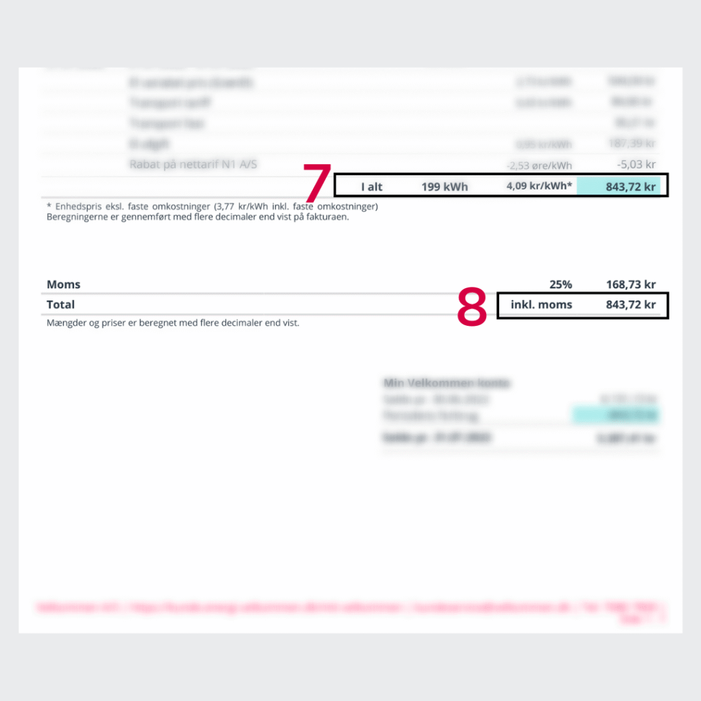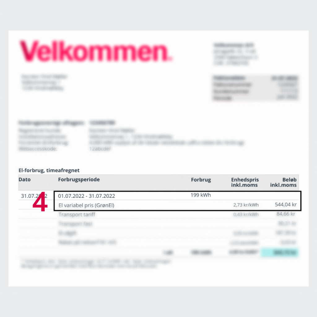Dette felt viser din samlede pris for dit totale kWh-forbrug i perioden. Ydermere kan du se kWh-enhedsprisen ekskl. og inkl. faste omkostninger.