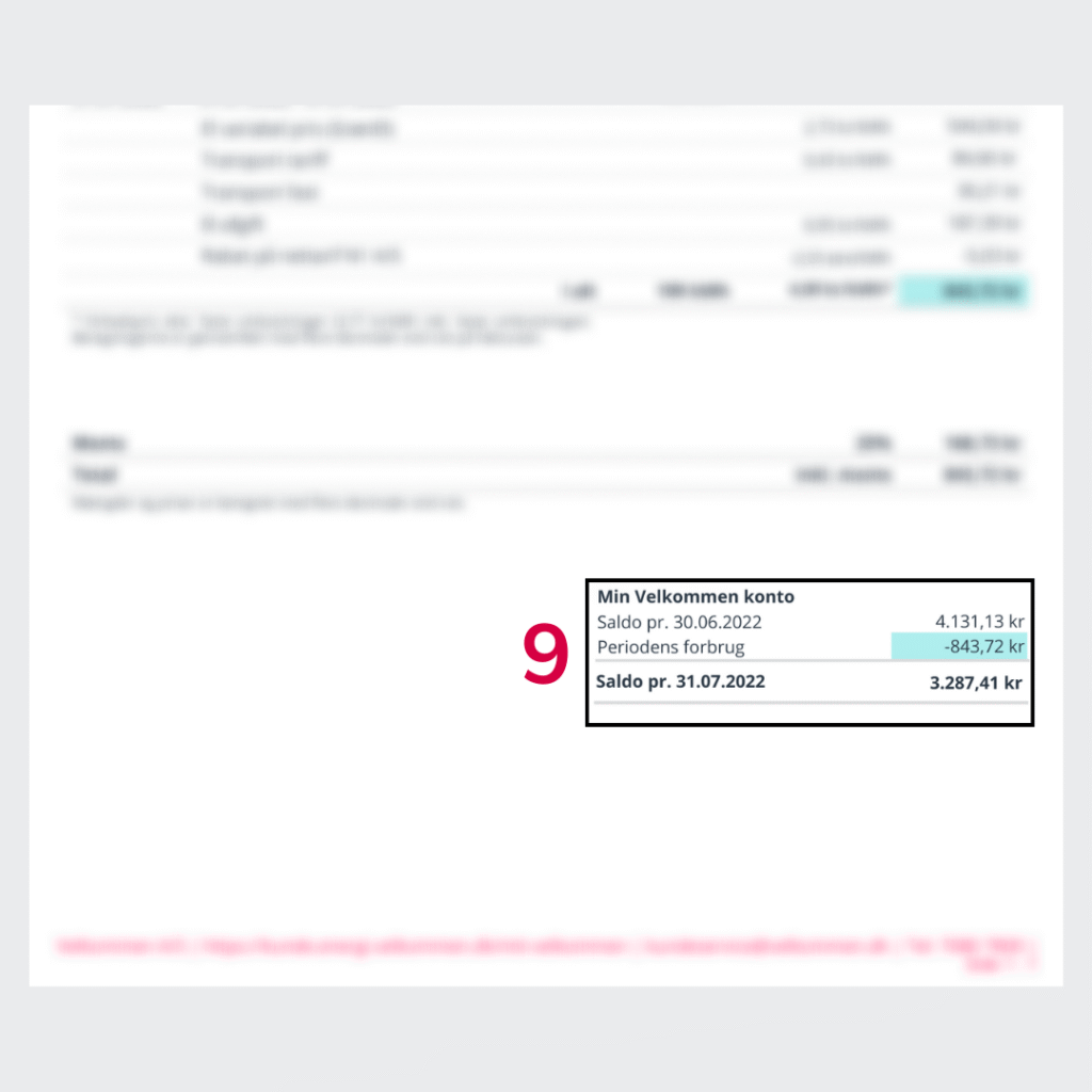 I denne boks får du et overblik over din MitVelkommen-konto. Her kan du se din saldo inden den nævnte periode er trukket fra. Du kan samtidig se det, du skal betale for det aktuelle månedsforbrug samt hvad din MitVelkommen-saldo efterfølgende vil være, når beløbet er trukket.
