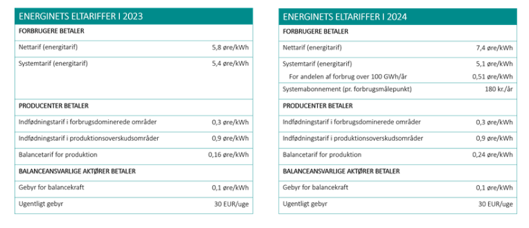 Nedenfor kan du se alle Energinets eltariffer og gebyrer for henholdsvis 2023 og 2024.